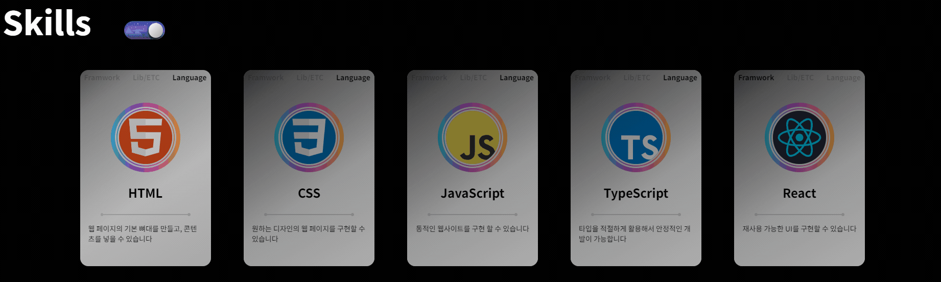 {/* 카드 상단의 기술 스킬 분류. 기술에 맞는 분류에 색을 진하게 함 */}